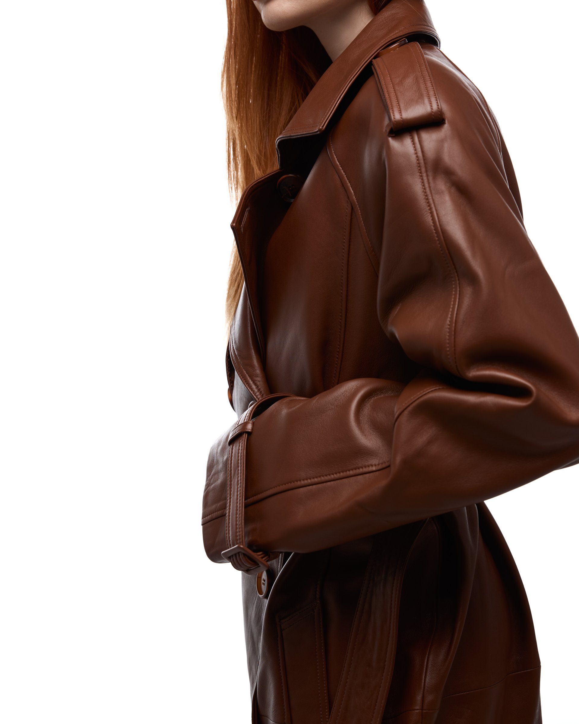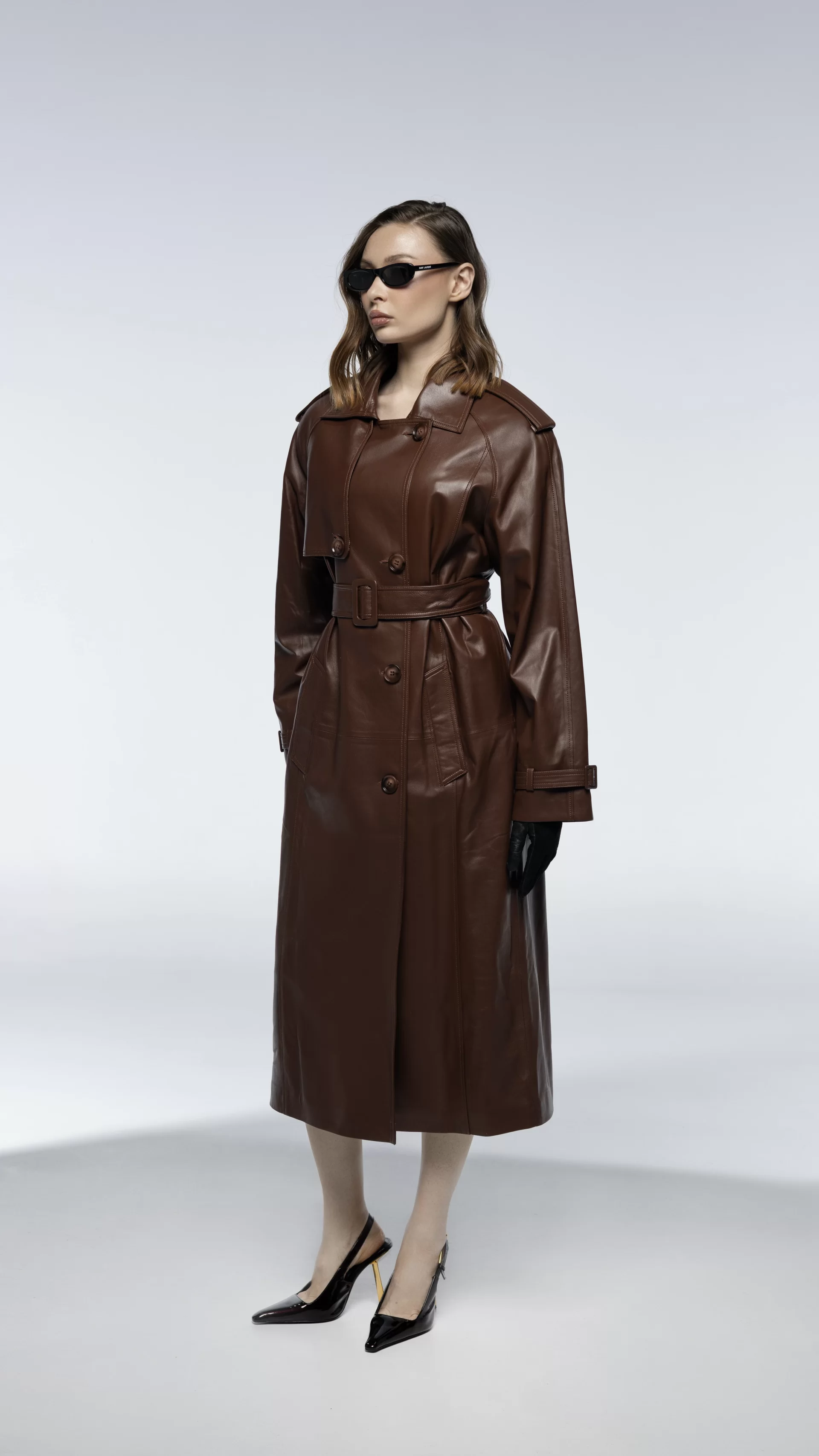 Модель выполнена в классическом тренч-силуэте с чёткой линией плеч и выверенными пропорциями. Натуральная кожа придаёт образу характер и структуру, а лаконичный крой делает тренч универсальным элементом гардероба.